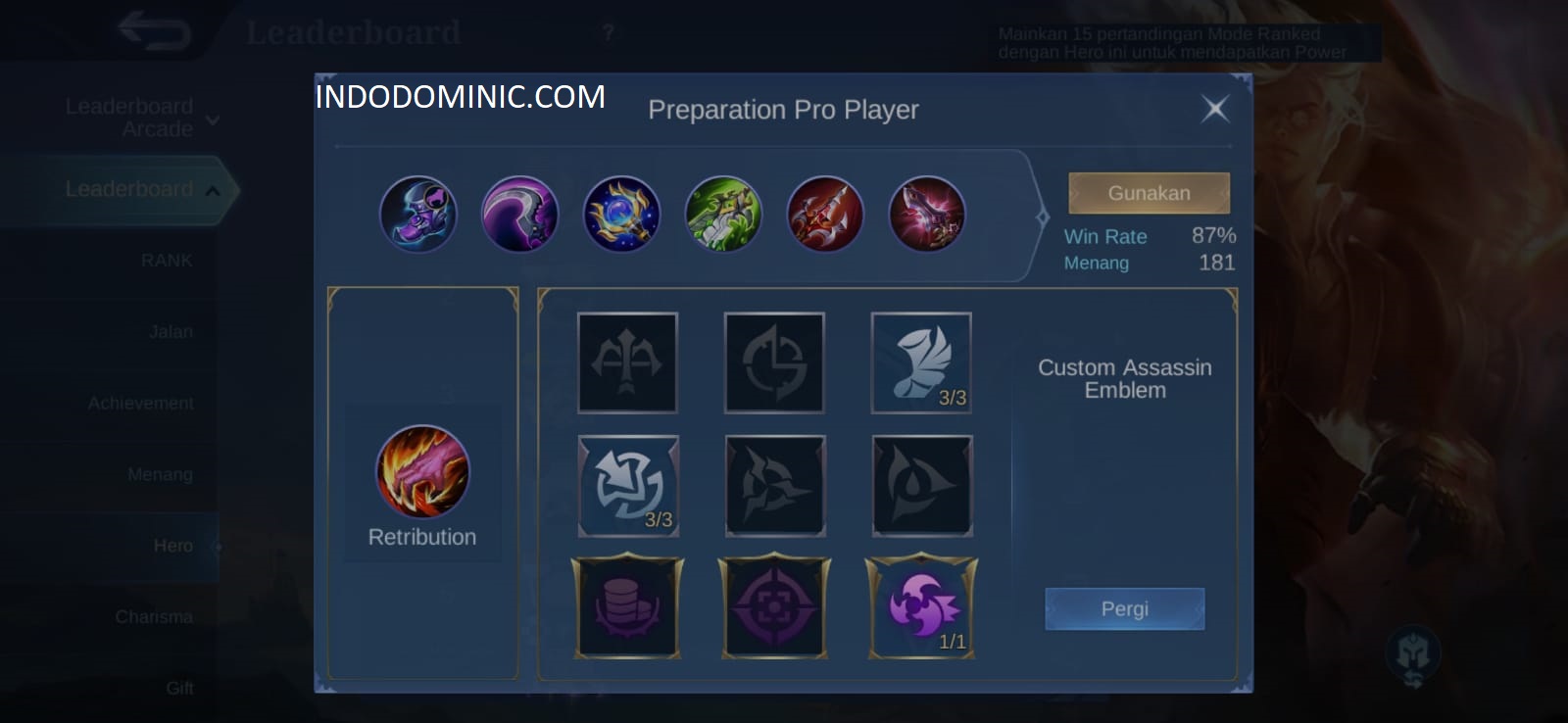Di build top global yang pertama, kita menggunakan Retribution dan menggunakan Emblem Assasin (Killing Spree). Dengan menggunakan Emblem Assasin Killing Spree ini dapat memulihkan dan meningkatkan Max HP dan Movemeent Speed saat kita mengeleminasi hero lawan.