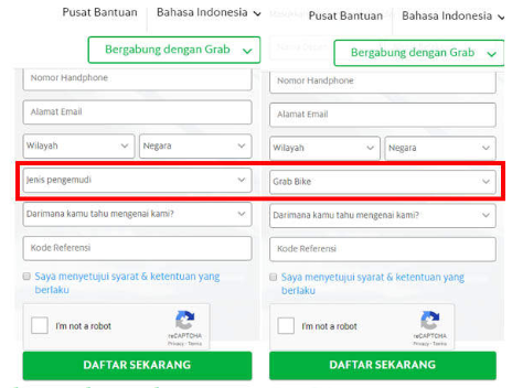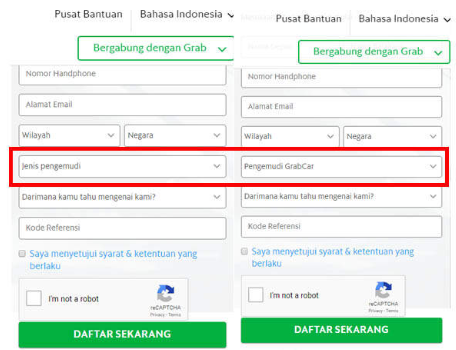 1. Anda bisa berkunjungi kehalaman pendaftaran Grab Mobil DISINI! dan dibagian Jenis Pengemudi > Pilih Pengemudi GRABCAR.