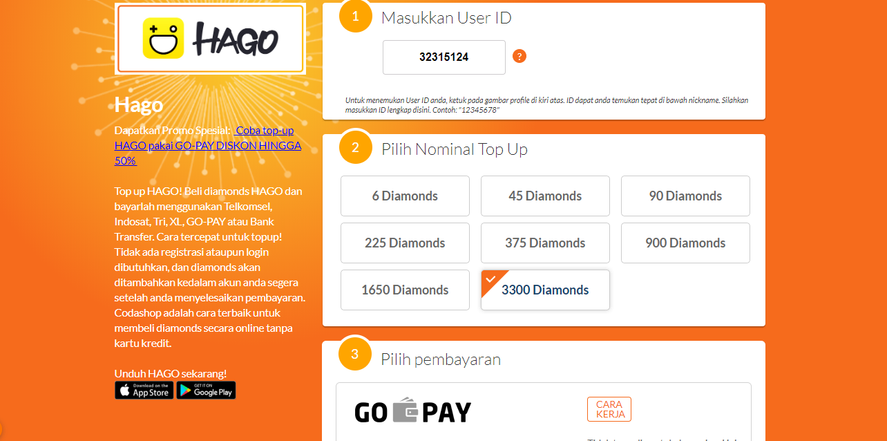 3. Silahkan sobat isi data yang dibutuhkan seperti User ID Hago, Nominal Top Up yang ingin sobat isi, Pembayaran dll