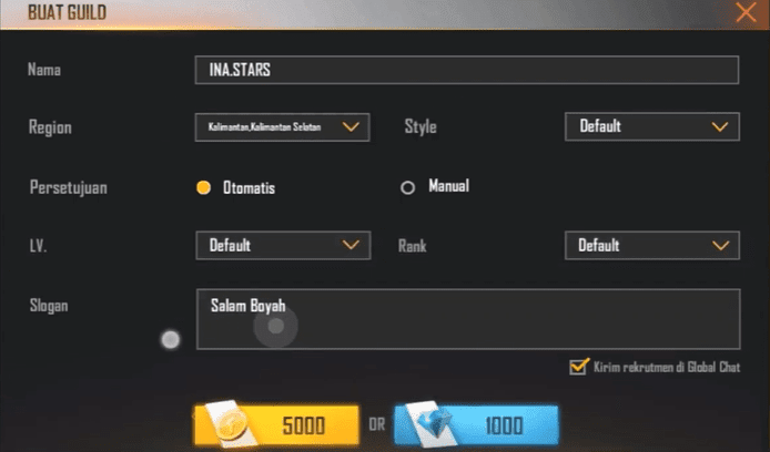 Untuk membuat sebuah guild di free fire, kamu bisa menggunakan diamond ataupu gold. Saya sarankan untuk menggunakan Gold dibandingkan dengan Diamond.