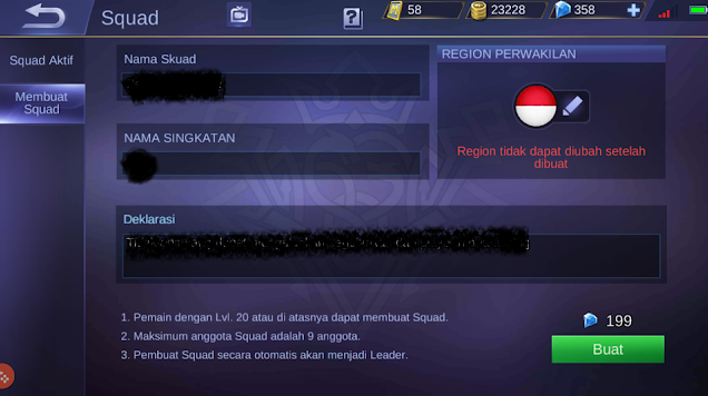 3. Selanjutnya sobat lihat menu bar “Membuat Squad” di sebelah kiri atas. Klik itu dan tinggal sobat atur informasi squad sobat seperti:
