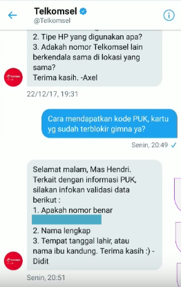 Kalo sobat malas untuk menelepon pihak Telkomsel, sobat bisa menghubunginya melalui Media Sosial. Kali ini gua akan kasik tau cara menghubungi pihak Telkomsel untuk mendapatkan kode puknya.
