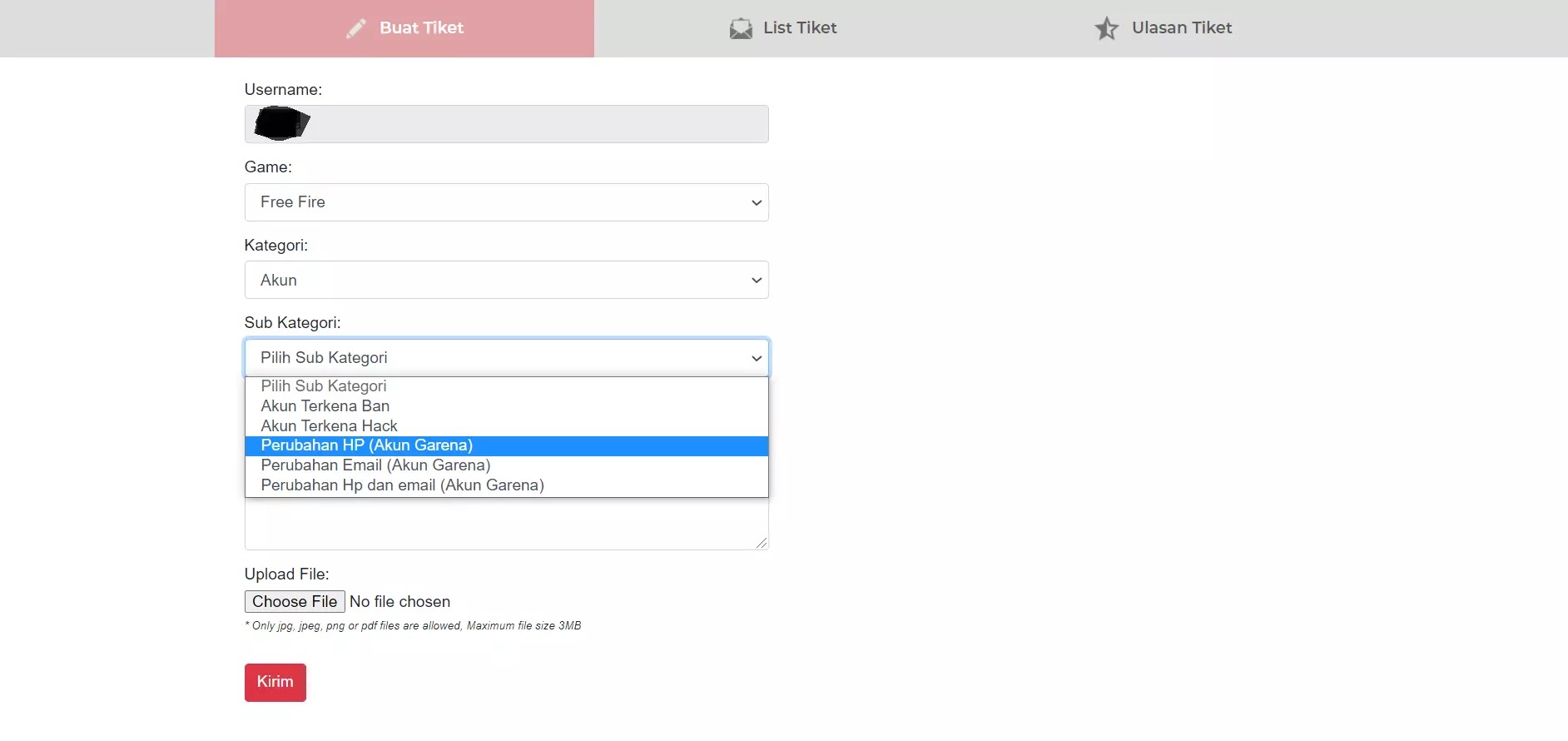 4. Pilih Sub Kategori sesuai dengan masalah yang kamu hadapi. Untuk Akun Guest FF yang hilang bisa kamu pilih Akun Terkena Hack atau Perubahan HP (Akun Garena).