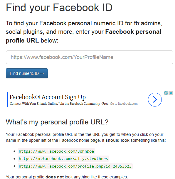 2. Setelah link laman yang saya berikan terbuka, anda akan melihat kata “To find your facebook personal numeric ID for fb:admins, social plugins, and more, enter your Facebook personal profle URL below”.