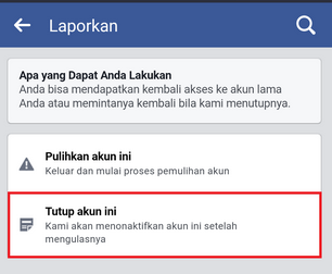 Setelah itu klik “Laporkan” , Pilih “Pulihkan atau Tutup Akun”