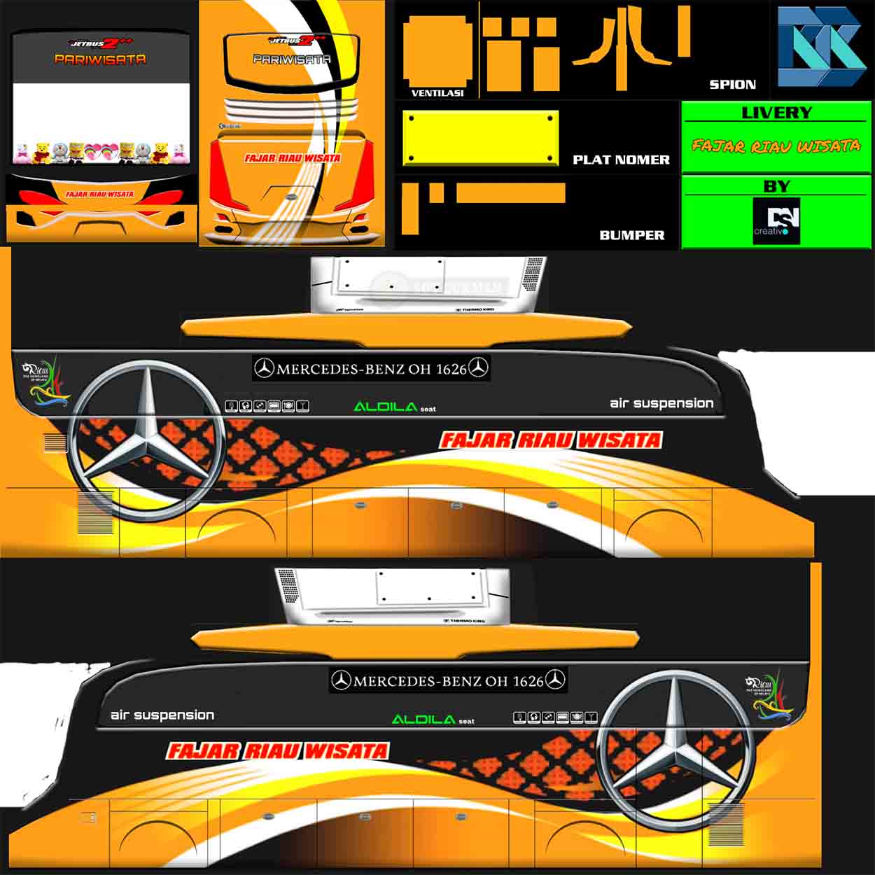 Perpaduan gradasi warna yang pas serta dengan detail – detail di setiap sudut yang ada, menjadikan livery ini seperti hidup jika digunakan pada bus yang kamu miliki.