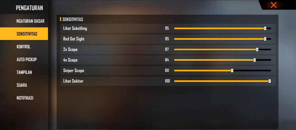 - 2x Scope: Sensitivitas dimana kamu menggeser layar saat sedang membidik saat kamu menggunakan senjata dengan 2x scope.