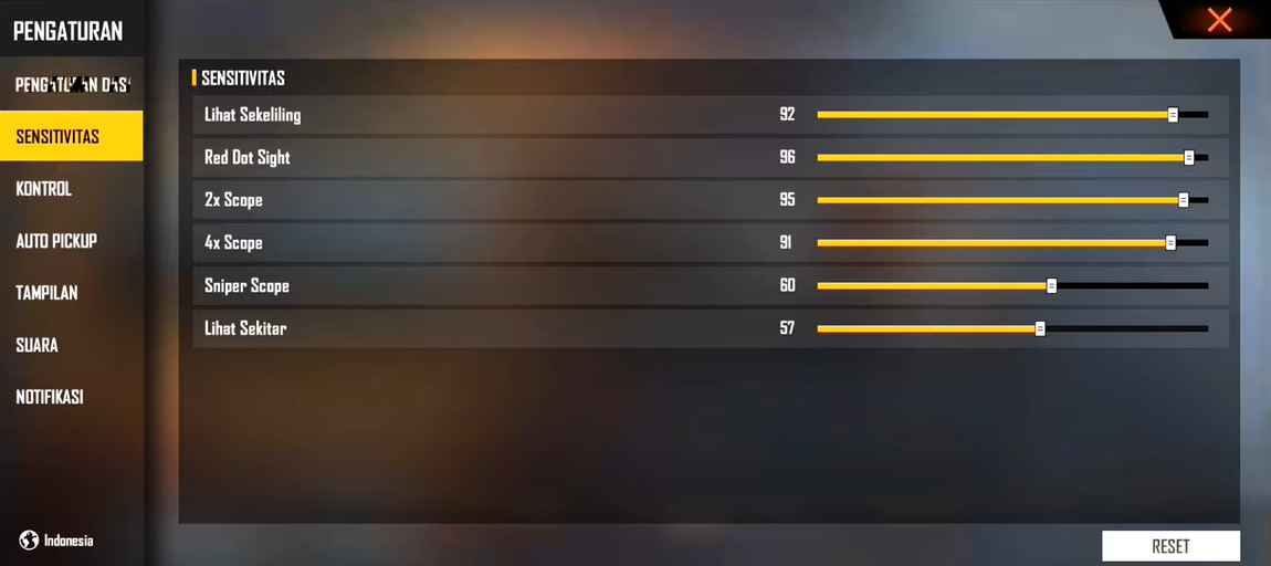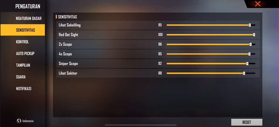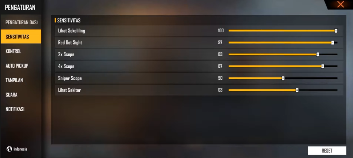 - Selanjutnya settingan pengaturan ff kamu akan secara otomatis di setting dari General, Red Dot Sight, 2x Scope, 4x Scope dan Sniper Scope.
